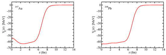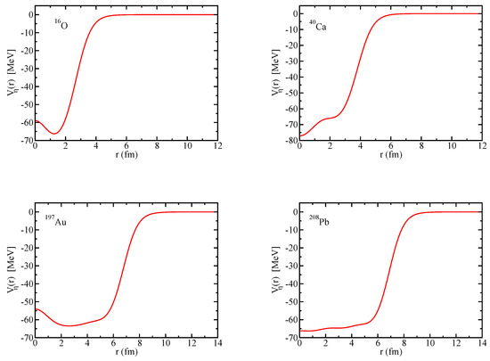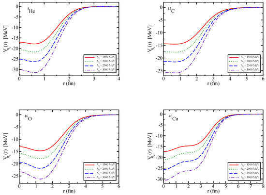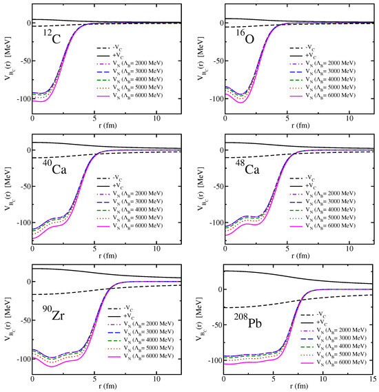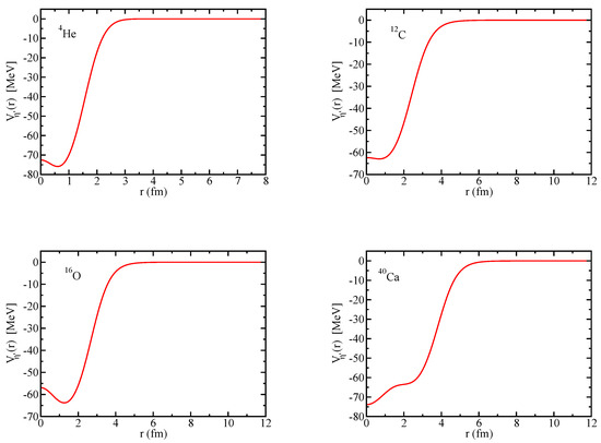 where the mean field potentials are defined by , , and , with , , and being the corresponding quark–meson coupling constants. We assume SU(2) symmetry, . The Lorentz-scalar “effective quark masses” are defined by, , and thus is dominated by as baryon density increases, and can be negative, but one should not demand the positivity of usual particle mass, since this is nothing but the reflection of the strong attractive scalar potential. Note that , since the field does not couple to the heavier (“heavy”) quarks in the QMC model. Furthermore, when we consider symmetric nuclear matter (SNM) with Hartre approximation, the -meson mean field becomes zero, , in Equations (1) and (2), and we can ignore hereafter. However, when we consider the meson–nucleus bound states, the isospin dependent -meson mean field, as well as the Coulomb potential in nuclei, will be included if necessary. In this study, only the Coulomb potentials for the -nucleus bound states will be considered.