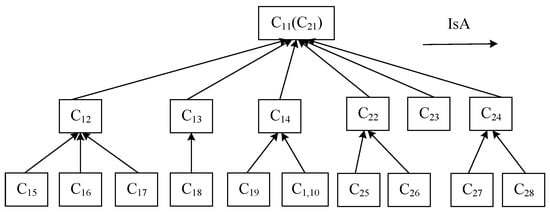 | Step 1: Based on the concept set of one of the ontologies, all the concepts of C1 and C2 are combined into a new concept set, denoted as Cnew, and only one is taken for the same concept. Step 2: Construct a new concept vector as from the new concept set; Step 3: Obtain the structure matrices F1 and F2 of the two ontologies to be fused by matrix operation; Step 4: Fnew can be derived from the previous algorithm; Step 5: From and , all concepts of ci, i = 0, 1, 2, …, m + n − s. Step 6: Based on this, a new ontology after fusion can be constructed. |