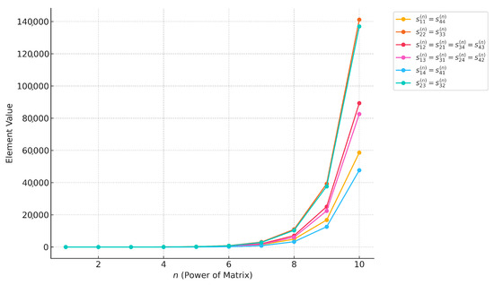 To illustrate the growth behavior of the matrix entries for higher powers n, we analyzed the six algebraically independent elements of the matrix as identified in Equation (9). These include the diagonal terms and , as well as the symmetric off-diagonal entries such as , among others. Figure 1 displays the numerical growth of these six entries for . The plot reveals that all components increase rapidly with n, exhibiting exponential-like behavior, particularly in off-diagonal elements closer to the matrix center, which suggests stronger propagation effects through the recursive structure of .