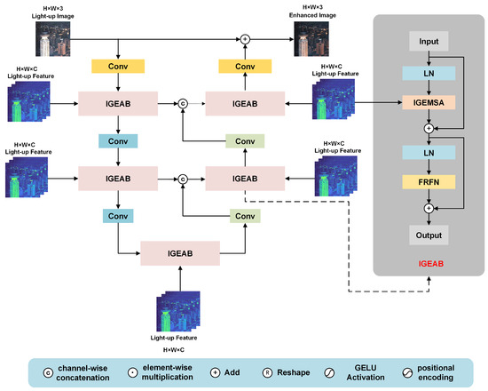 - We proposed an illumination feature-guided corruption restorer that adopts a three-scale U-shaped [28] structure, and design the Illumination-Guided enhanced Attention Block (IGEAB) for feature enhancement to correct low-light image noise, artifacts, color distortion, and other problems.
