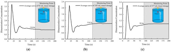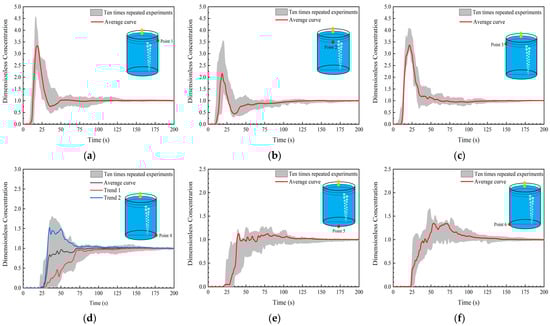 To evaluate the repeatability of the experiment, a representative case involving the addition of 185 mL of saturated NaCl solution was selected for ten repeated trials. The resulting dimensionless concentration curves were compared and analyzed. As shown in Figure 2, the maximum and minimum concentration curves were used to generate a shaded region over time [90], visually representing the range of variation. These figures indicate that the variation range of the repeated experimental data at these monitoring points was relatively small compared to the average curve. Table 4 summarizes the mixing times obtained from ten experimental repetitions. The average mixing time from the ten trials was adopted as the representative value for each monitoring point. The standard deviation between the individual mixing times and their average was also calculated. Results showed that the standard deviation at all monitoring points remained within 12%, indicating good repeatability and high reliability of the measured data.