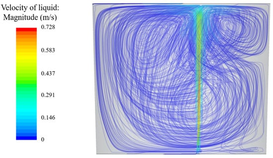 The computational fluid dynamics (CFD) model results for the streamlines in the ladle are shown in Figure 3. In this study, the Euler–Euler multiphase flow model combined with the Realizable k-ε turbulence model was employed to solve the continuity and momentum equations, as well as to compute the steady-state flow field. The modeling strategy, mesh testing, simulation software (STAR-CCM+ 13.04), and validation followed the methodology used in our previous work [91]. Since these CFD results were not the primary focus of this study, a detailed simulation setup is not described here. From the simulation results, it can be observed that, after the gas entered through the bottom-blowing nozzle, a gas plume formed and rose toward the free surface. The flow field in the ladle can be divided into three regions: a large recirculating flow that forms on the left side of the ladle; a smaller recirculating flow that develops in the upper right region of the gas plume; and the left-side recirculating flow and the smaller right-side recirculating flow that meets in the lower-right region, merging into the gas plume, completing the circulation, and forming a fully developed flow field.