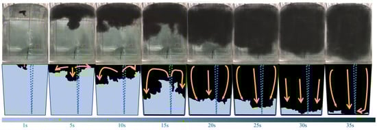 Figure 4 illustrates the movement of a 100 mL ink–salt solution mixed tracer in the ladle under a bottom-blowing gas flow rate of 2.3 L/min after being injected at the center of the ladle’s liquid surface. At 1 s, the tracer penetrated the liquid surface and began convection transport downward. At 5 s, the tracer reached approximately one-third of the liquid depth (330 mm below the surface). By this time, the ink component had already spread across the surface, forming a black layer covering the entire top region. At 10 s, the ink started descending along the left-side wall, with significantly more ink observed on the left than on the right. At 15 s, the downward convection transport of the ink on both sides became nearly symmetrical. However, due to the gas injection port being located on the right side, the main recirculating flow occurred on the left, resulting in a higher ink concentration on the left side. Between 20 s and 30 s, the ink continued to convection transport downward at a synchronized and slow rate on both sides, indicating that, at 2.3 L/min, the gas flow had a significantly weaker influence on tracer movement compared to a higher gas flow rate of 8.3 L/min. At 35 s, the tracer began spreading from the bottom right toward the left, eventually dispersing throughout the ladle.