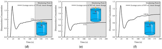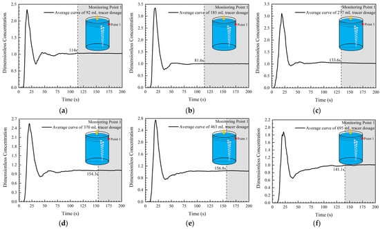 Dimensionless concentration curves of different volume tracers at Monitoring Point 1: (a) 92 mL, (b) 185 mL, (c) 277 mL, (d) 370 mL, (e) 463 mL, and (f) 695 mL.