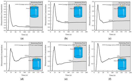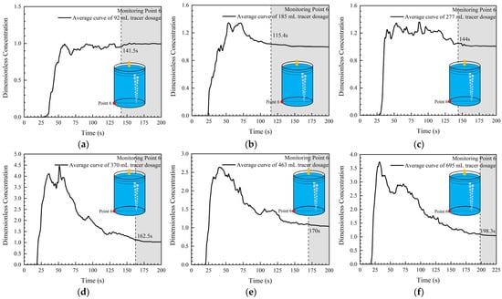 Dimensionless concentration curves of different volume tracers at Monitoring Point 6: (a) 92 mL, (b) 185 mL, (c) 277 mL, (d) 370 mL, (e) 463 mL, and (f) 695 mL.
