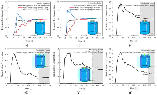 Dimensionless concentration curves of different volume tracers at Monitoring Point 4: (a) 92 mL, (b) 185 mL, (c) 277 mL, (d) 370 mL, (e) 463 mL, and (f) 695 mL.