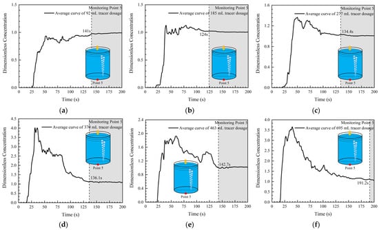Dimensionless concentration curves of different volume tracers at Monitoring Point 5: (a) 92 mL, (b) 185 mL, (c) 277 mL, (d) 370 mL, (e) 463 mL, and (f) 695 mL.