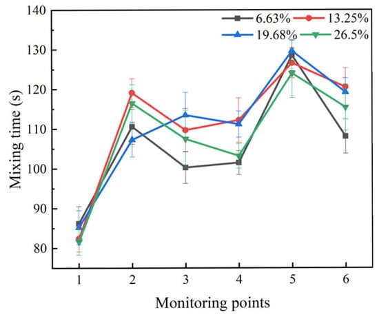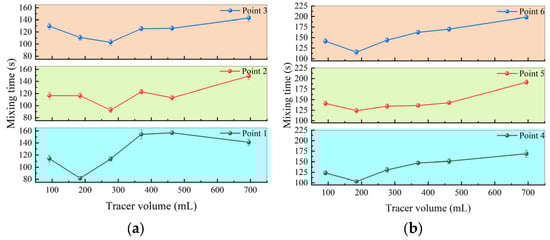 Mixing time at different monitoring points: the (a) top monitoring points and (b) bottom monitoring points.