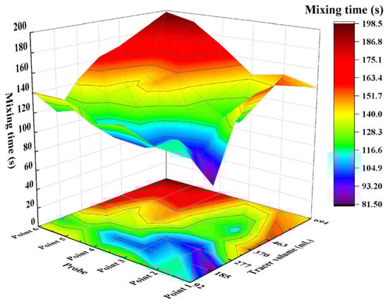 Figure 12 shows that the mixing times at the upper monitoring points were generally shorter than those at the lower monitoring points. This difference was particularly pronounced when larger tracer volumes were introduced as the mixing times at the lower monitoring points became significantly longer than those at the upper monitoring points. This observation suggests that the gas flow rate was insufficient to fully disperse larger volumes of tracer within the ladle. The three-dimensional visualization further confirmed that when the tracer volume was 185 mL, the mixing time was notably shorter compared to other tracer volumes. Additionally, the mixing time initially decreased and then increased as the tracer volume increased.