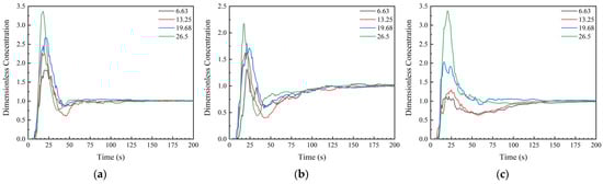 As shown in Figure 13a–c, changes in NaCl concentration had a limited impact on the dimensionless concentration curves at the upper monitoring points. The tracer arrival time at the top was nearly identical across all concentrations, and the differences in the time to initial response were minimal. This indicates that the tracer response in the upper region was relatively stable. However, the peak concentration decreased progressively as the NaCl concentration decreased, suggesting that, although the diffusion rate was not significantly affected, the signal intensity detected by the probes was influenced by the tracer concentration. In contrast, as shown in Figure 13d–f, the effect of the NaCl concentration was more pronounced at the bottom monitoring points. Notably, when the NaCl concentration was 19.68%, the bottom monitoring points exhibited significantly higher peak values than those observed under the other three conditions. This indicates that, at this concentration, the transport and accumulation of the tracer in the lower region was more effective. Moreover, at higher concentrations (19.68% and 26.5%), larger differences between the concentration curves were observed, whereas, at lower concentrations (6.63% and 13.25%), the curves tended to converge, indicating reduced sensitivity to concentration changes. Further analysis from Figure 14 reveals that the influence of NaCl concentration on the mixing time varied among different monitoring points. The most significant effects were observed at Monitoring Points 3, 4, and 6. Nevertheless, the overall mixing trends remained consistent, indicating that, while concentration changes can affect local signal intensity and mixing time, they do not significantly alter the global mixing behavior. In summary, the results of the controlled concentration experiments suggest that, under a constant tracer volume, the effect of the NaCl concentration on mixing behavior is region-specific, with the bottom of the ladle being more sensitive to concentration variations.