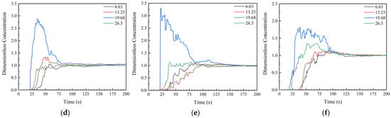 Dimensionless concentration curve summary chart: (a) Monitoring Point 1, (b) Monitoring Point 2, (c) Monitoring Point 3, (d) Monitoring Point 4, (e) Monitoring Point 5, and (f) Monitoring Point 6.