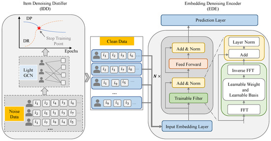 The overview of SR-DFN. The proposed SR-DFN integrates dual-domain denoising mechanisms for robust sequential recommendation. The item denoising distiller (IDD) operates in the temporal domain, processing noisy implicit feedback sequences to distill purified interaction signals. The refined output of the IDD is subsequently fed into the embedding denoising encoder (EDE), which transforms the temporal sequences into the frequency domain via spectral analysis.