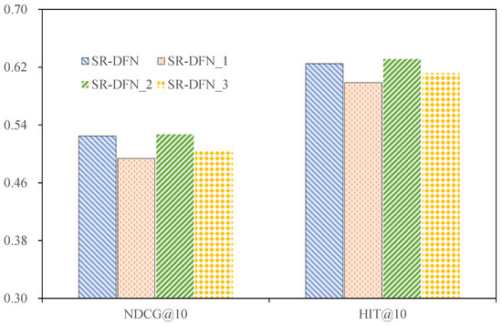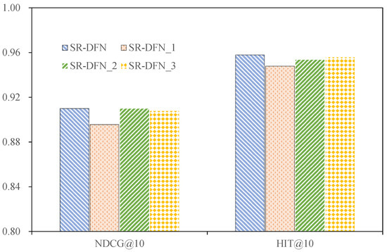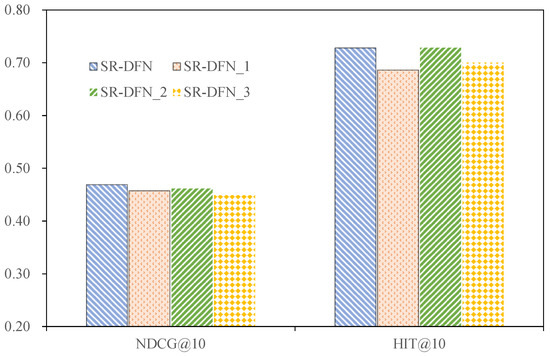 - Spectral Modulation Mechanism: While FMLP-Rec employs learnable amplitude weights, SR-DFN introduces joint amplitude–phase optimization via Equation (11), the adaptive phase alignment of which is absent in FMLP-Rec. Further analysis of the ablation experiment is given in Section 4.3.2.