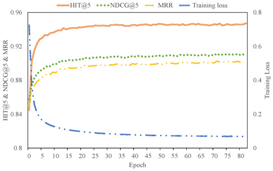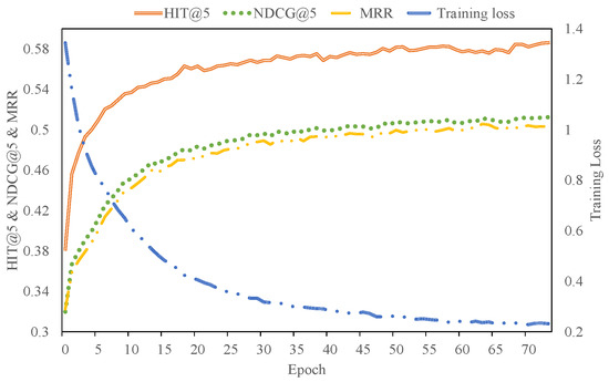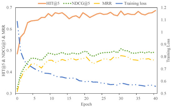 Testing metrics (HIT@5, NDCG@5, and MRR) and the training loss of our approach for the MovieLens dataset with the increase in epochs.