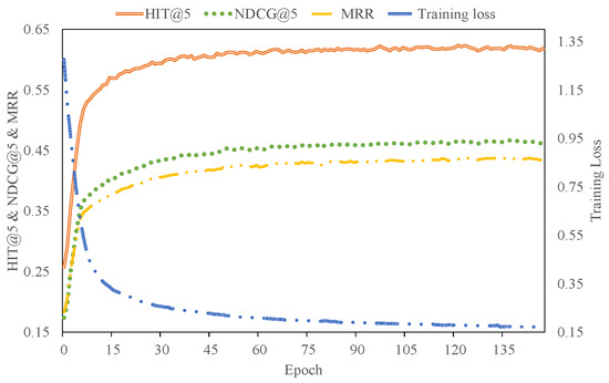 Testing metrics (HIT@5, NDCG@5, and MRR) and the training loss of our approach for the Yelp dataset with the increase in epochs.