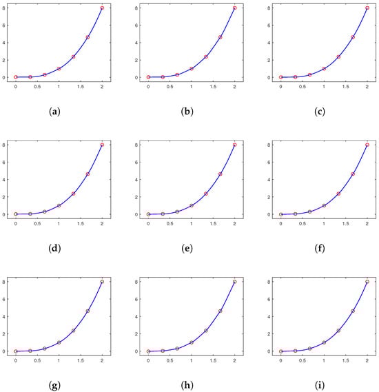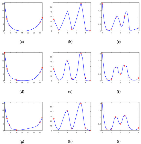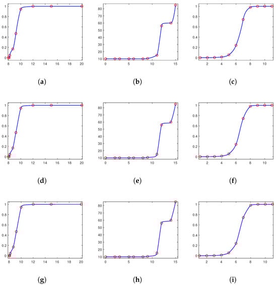 Comparison of the monotonicity-preserving interpolation curves for the convex data set given in Table 10, Table 11, and Table 12, respectively. (a) By our method. (b) By our method. (c) By our method. (d) By the method given in [6]. (e) By the method given in [6]. (f) By the method given in [6]. (g) By the method given in [14]. (h) By the method given in [14]. (i) By the method given in [14].