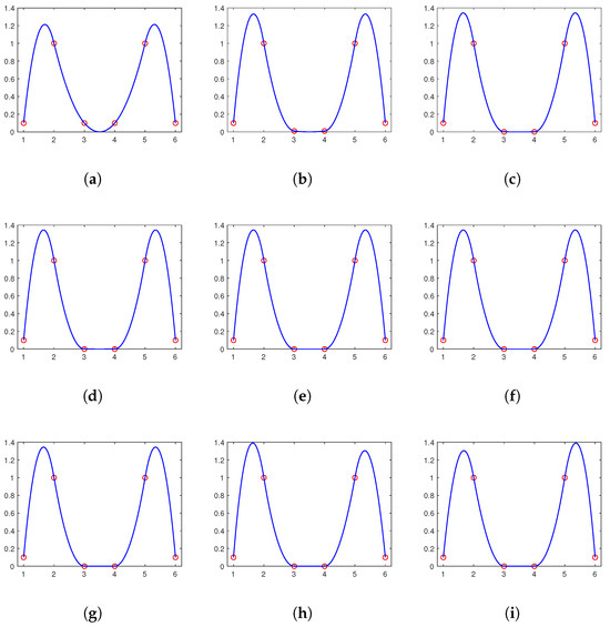 In this example, we consider the positive data set given in Table 5. For different values of θ, we show the choices of and and the corresponding optimal minimizers given by (52) in Table 6. Figure 3 shows the corresponding positivity-preserving interpolation curves for different cases. From the results, we can see that the positivity-preserving interpolation curves preserve the shape of the different cases of positive data sets well.