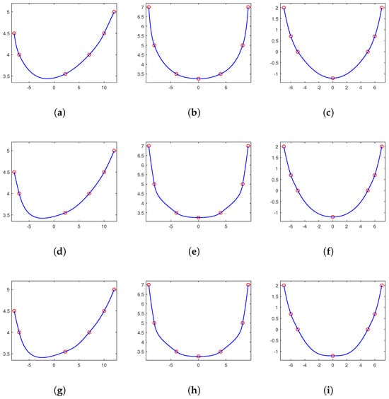 Comparison of the convexity-preserving interpolation curves for the convex data sets given in Table 7, Table 8, and Table 9, respectively. (a) By our method. (b) By our method. (c) By our method. (d) By the method given in [12]. (e) By the method given in [12]. (f) By the method given in [12]. (g) By the method given in [13]. (h) By the method given in [13]. (i) By the method given in [13].