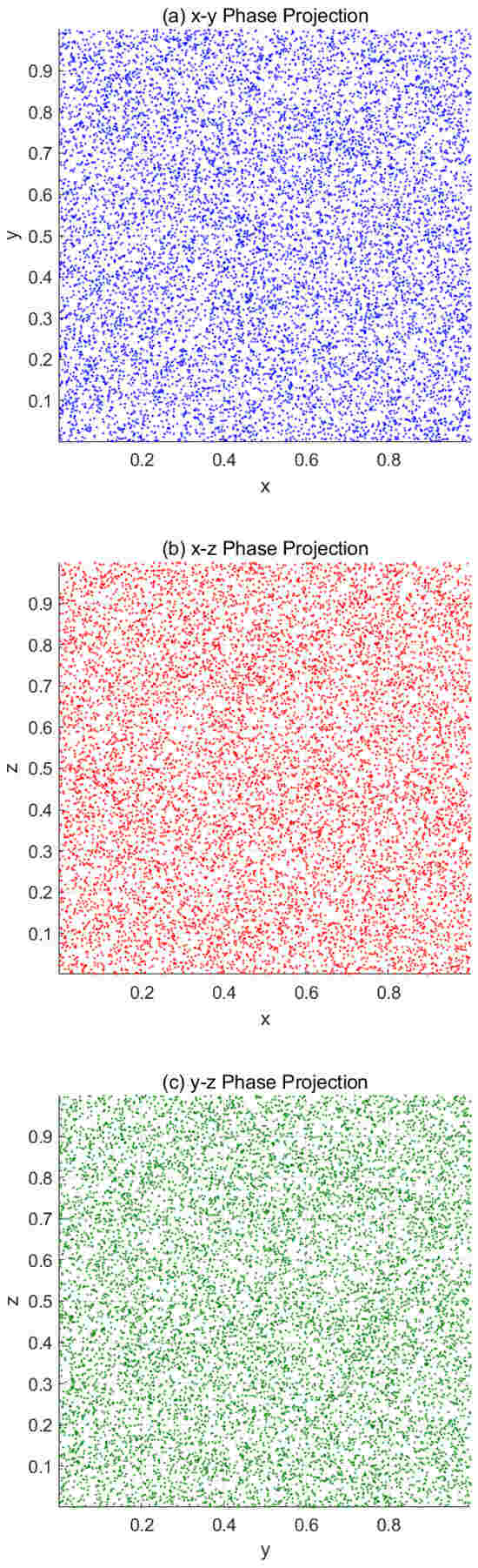 Phase diagram. (a) x–y projection. (b) x–z projection. (c) y–z projection.
