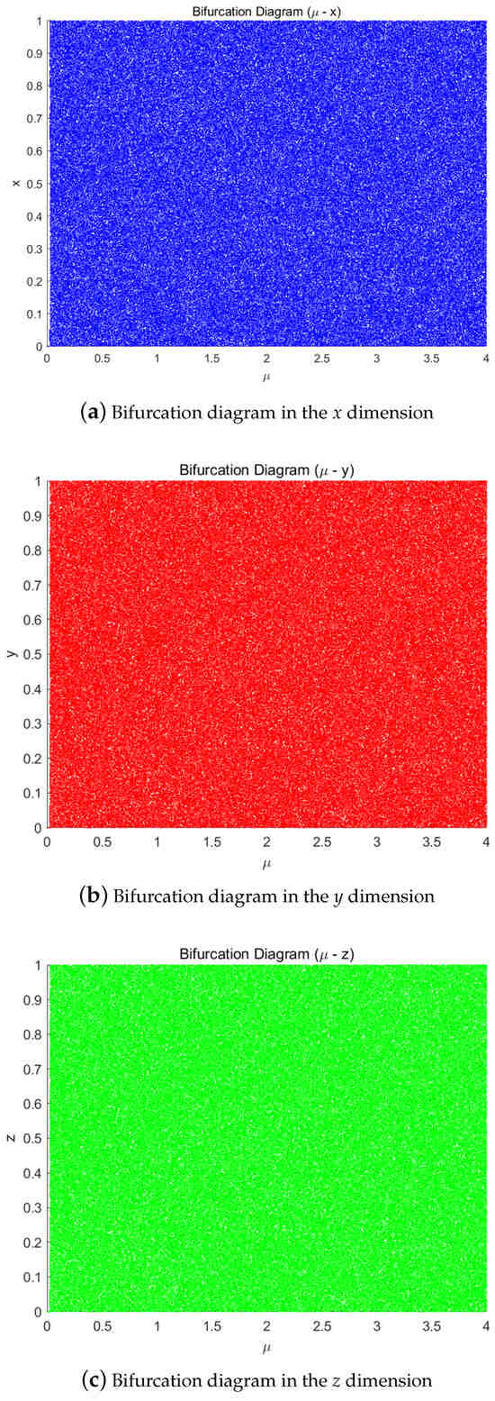 Bifurcation diagrams of the chaotic system in different dimensions. (a) x-dimension. (b) y-dimension. (c) z-dimension.