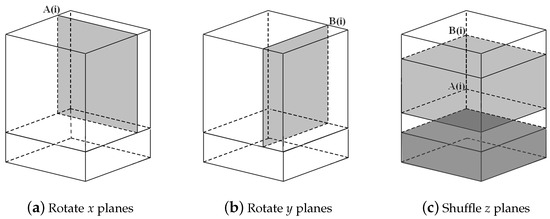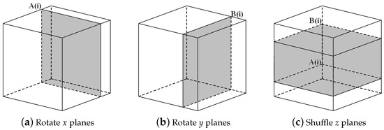 We propose a 3D scrambling method combining the benefits of the Rubik’s Cube rotation model and poker shuffle model. In the three-dimensional coordinate system, we define the set of all pixels with the same x coordinates as an x plane, the set of all pixels with the same y coordinates as a y plane, and the set of all pixels with the same z coordinates as a z plane. As shown in Figure 6, in one single round of iteration, one operation of rotation on an x plane, one operation of rotation on a y plane, and one operation of shuffle on z planes are carried out to sufficiently scramble the pixels. The scrambling process is as follows: