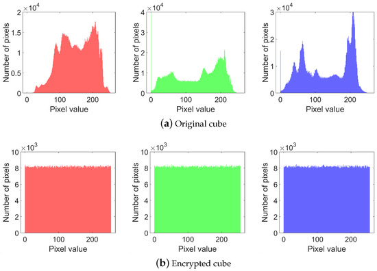To resist statistical attacks, the histogram of the encrypted image must be uniform and completely different from that of the plaintext image. The histograms of a plaintext image are shown on the top row in Figure 10 and those of an encrypted image are shown on the bottom row. It can be observed that the histograms of the three channels in the plaintext cube are non-uniform, whereas those of the encrypted cube are uniform and exhibit a marked difference from the plaintext histograms. The test results and entropy are shown in Table 3.