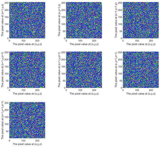 A correlation analysis reflects the algorithm’s scrambling impact. In order to prevent statistical attacks, the strong connections must be broken. To analyze the correlation between adjacent pixels in this scheme, 10,000 pixels were randomly selected from both the original plaintext cube and the encrypted cube. For each selected pixel, its adjacent pixels were identified along seven directions: x, y, z, , , , and . Correlation analysis scatter plots were drawn using the pixel values of each pair as the horizontal and vertical coordinates, as shown in Figure 11 and Figure 12. The corresponding correlation coefficients are listed in Table 4.