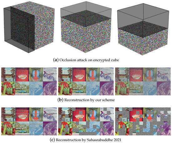 We deleted 25% and 50% of the encrypted cube to simulate an occlusion attack, as shown in Figure 13a. We treated all of the missing data as zeros. The decrypted images using our scheme are as shown in Figure 13b, and the decrypted images using scheme [31] are shown in Figure 13c. The quality analysis of the reconstructed images is shown in Table 5.