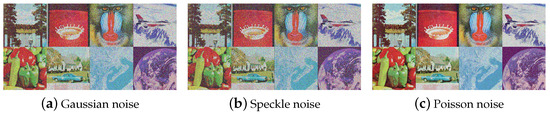 Encrypted images may experience noise disturbance when transmitted over unsecure channels. A good encryption scheme should have some tolerance for noise attacks. Gaussian noise, Poisson noise, and speckle noise were added to the encrypted cube, and the decrypted image is shown in Figure 14.