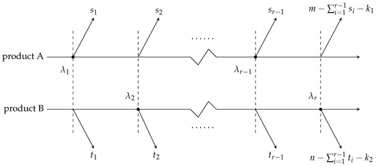 Let for , where and denote the number of units withdrawn at the i-th failure for the X and Y samples, respectively. Both and are random variables with unknown values. The observed data consist of , where indicates the source of failure, with if corresponds to an X failure and if it corresponds to a Y failure. The vector contains the failure times, and represents the number of units withdrawn from the X sample at each failure time. A concise overview of this type II censoring method is provided in Figure 3.