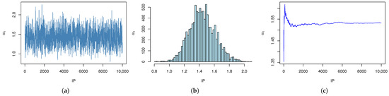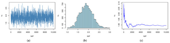 Histograms, cumulative mean plots, and estimation plots of the parameters produced by the MCMC method under gamma IPs and NIPs are shown in Figure 4, Figure 5, Figure 6, Figure 7, Figure 8 and Figure 9 (taking , ) as an example). These plots demonstrate good convergence behavior, as evidenced by the stable cumulative means and well-mixed histograms.