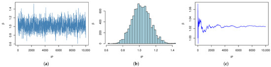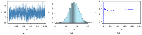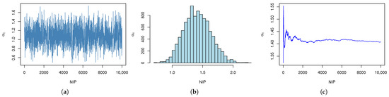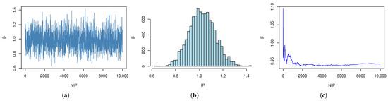 Simulation of with IP.(a) The trace plot of MCMC samples of with IPs. (b) Histogram of with IPs. (c) Cumulative mean plots of with IPs.