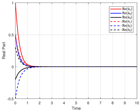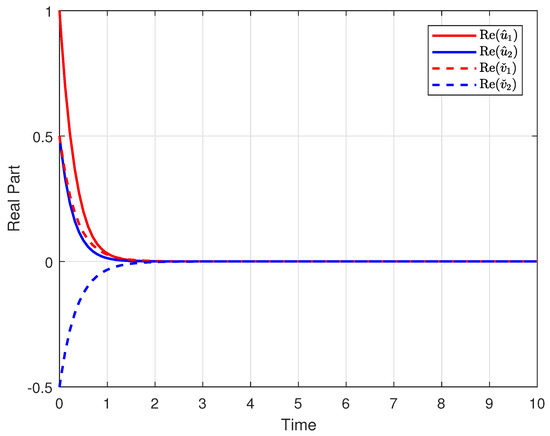 The real part and imaginary part state trajectories of and in Example 1 are given in Figure 1 and Figure 2, respectively.