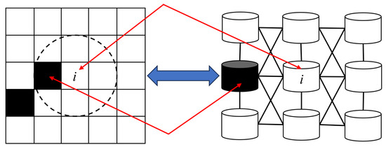 In the BINN algorithm, the mobile robot navigates a network space composed of neurons. This network can be viewed as a topological state space that represents the space in which the robot moves. The position of the target point affects the neurons in the network by passing activity values, thus forming a neuronal activity field with different activities. The robot moves to the target location according to specific rules. In the initial stage, the activity value of all neurons is 0. As the position of the target point is affected, the activity value of the neurons changes. The change in neuron activity values in the neural network is modeled as Equations (9)–(12):