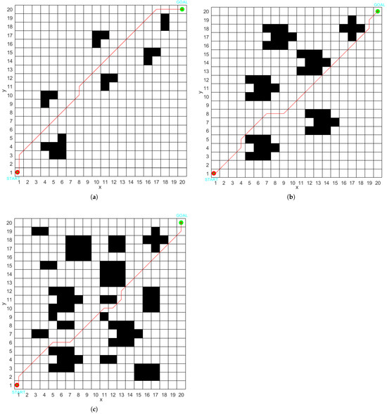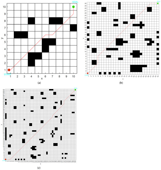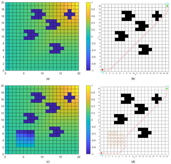 serves as a correction constant for complex road environments, aimed at adjusting the overall influence of the road environment model. Typically set at 0.01, this value ensures the numerical stability of the complex road environment model . The selection of should consider both the robot’s performance and the complexity of the environment. In situations where the environment is intricate and the robot’s adaptability is limited, can be increased to amplify the model’s influence. Conversely, a decrease in reduces the model’s impact, which may lead to path planning results that favor shorter routes with suboptimal environmental conditions. Conversely, an increase in will place greater emphasis on environmental quality, leading the robot to avoid complex paths. However, if is set too high, it may result in the robot excessively steering clear of complex roads, ultimately increasing path distances or even preventing the planning of a viable route.