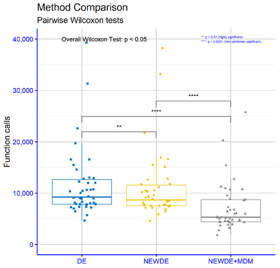 The statistical analysis (Pairwise Wilcoxon Test [42]) conducted using the R programming language to compare classical differential evolution (DE), modified DE (NEWDE), and modified DE with the majority dimension mechanism (NEWDE + MDM) yielded significant conclusions regarding the statistical differences between these methods, as shown in Figure 1. The p-values, which express the levels of statistical significance, revealed a highly significant difference (p < 0.01) between classical DE and modified NEWDE. This indicates that the improvements introduced in NEWDE led to a statistically significant performance enhancement. The comparison between classical DE and NEWDE + MDM showed an extremely significant difference (p < 0.0001), confirming that the addition of the majority dimension mechanism contributes very substantially to improving the algorithm’s effectiveness. Furthermore, the comparison between modified NEWDE and NEWDE + MDM also demonstrated an equally extremely significant difference (p < 0.0001). This proves that the majority dimension mechanism provides additional significant advantages even when compared to the already improved version of the algorithm. Overall, the statistical results confirm that both enhanced versions of the algorithm (NEWDE and NEWDE + MDM) are significantly better than classical DE, with NEWDE + MDM being particularly outstanding due to the incorporation of the majority dimension mechanism. These findings highlight the importance of the proposed modifications for improving the performance of the differential evolution algorithm.