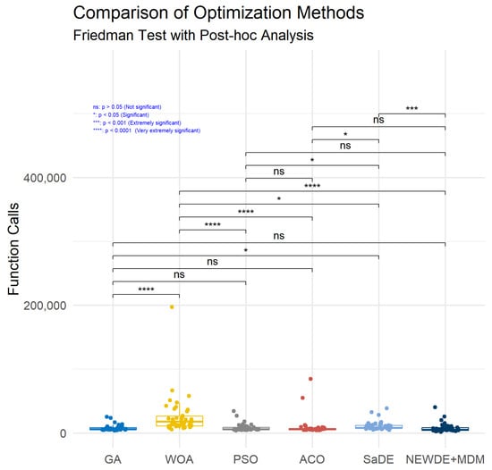 The results of the statistical analysis (Friedman test [44]) conducted in R for comparing various optimization methods revealed significant differences in their performance (Figure 3). Specifically, a very extremely significant difference (p < 0.0001) was observed between the GA and WOA, indicating that these two methods differ substantially in terms of performance. However, comparisons between the GA and PSO as well as the GA and ACO showed non-significant differences (p > 0.05), meaning their performances are statistically indifferent. The comparison between the GA and SaDE showed a significant difference (p < 0.05), suggesting that SaDE performs differently compared to the genetic algorithm. In contrast, the comparison between the WOA and PSO showed no significant difference (p > 0.05), while the WOA versus ACO again showed a very extremely significant difference (p < 0.0001). Furthermore, the WOA differs significantly (p < 0.05) from SaDE, but this difference becomes highly significant (p < 0.01) when examined in another context. The comparison between the WOA and the modified differential evolution (NEWDE + MDM) showed a very extremely significant difference (p < 0.0001), confirming the superiority of the latter method. The comparisons between PSO and ACO, as well as between ACO and NEWDE + MDM, showed non-significant differences (p > 0.05). However, PSO differs significantly (p < 0.05) from SaDE, as does ACO when compared to SaDE. Finally, the comparison between SaDE and the WOA confirms an extremely significant difference (p < 0.001), highlighting that SaDE has statistically better performance compared to the WOA. Overall, the results demonstrate that NEWDE + MDM stands out for its superior performance compared to the other methods, while the WOA shows large statistical differences relative to most of the other techniques. These findings can help in selecting the optimal method depending on the optimization problem at hand.