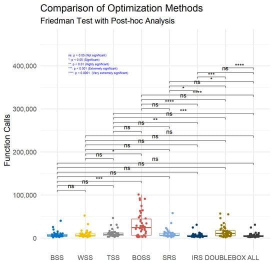 The results of the statistical analysis conducted to compare various termination rules revealed interesting findings regarding the statistical significance of their differences (Figure 4). Specifically, the comparison between the BSS (Best Solution Stopping) and WSS (Worst Solution Stopping) rules showed no significant difference (p > 0.05), indicating that these two termination approaches do not differ significantly in terms of their effectiveness. Similarly, non-significant differences were observed in comparisons between BSS and TSS (Total Solution Stopping), SRS (Solution Range Stopping), IRS (Iteration Range Stopping), doublebox, and “All”. However, the comparison between BSS and BOSS (Best Overall Solution Stopping) showed an extremely significant difference (p < 0.001), suggesting that the BOSS rule differs significantly from BSS. A similar, although less statistically significant, difference was observed between WSS and BOSS (p < 0.05). Notable differences were observed in the other comparisons. The TSS vs. IRS comparison showed a highly significant difference (p < 0.01), while TSS vs. “All” showed an extremely significant difference (p < 0.001). The differences between BOSS and IRS, as well as between BOSS and "All", were very extremely significant (p < 0.0001 in both cases). Significant differences were also observed between SRS and IRS (p < 0.05), and between SRS and “All” (p < 0.001). Finally, the IRS vs. “All” comparison showed a very extremely significant difference (p < 0.0001), while the doublebox vs. “All” comparison also showed a very extremely significant difference (p < 0.0001). These findings highlight that certain termination rules, such as BOSS and "All", show statistically significant differences compared to other rules, which may have important implications for selecting the optimal termination rule for different optimization problems.