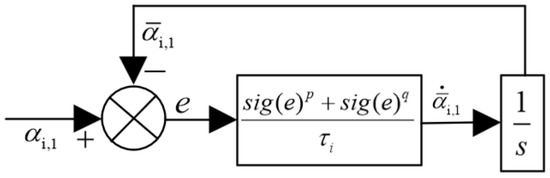 where is the number of UAVs, and is the relative position deviation between the i-th UAV’s position and the leader’s position. The diagram of the first-order fixed-time command filter [15] is shown in Figure 2.