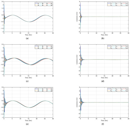 The consensus control simulation results of the numerical simulation in Example 1: (a) The trajectories of 8 followers under the proposed controller. (b) The consensus errors under the proposed controller. (c) The trajectories of 8 followers under [14]. (d) The consensus errors under [14]. (e) The trajectories of the 8 followers under [25]. (f) The consensus errors under [25].