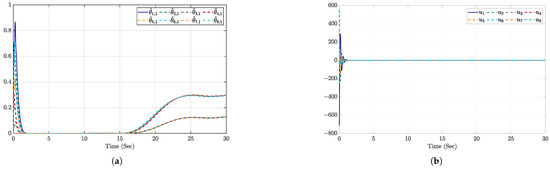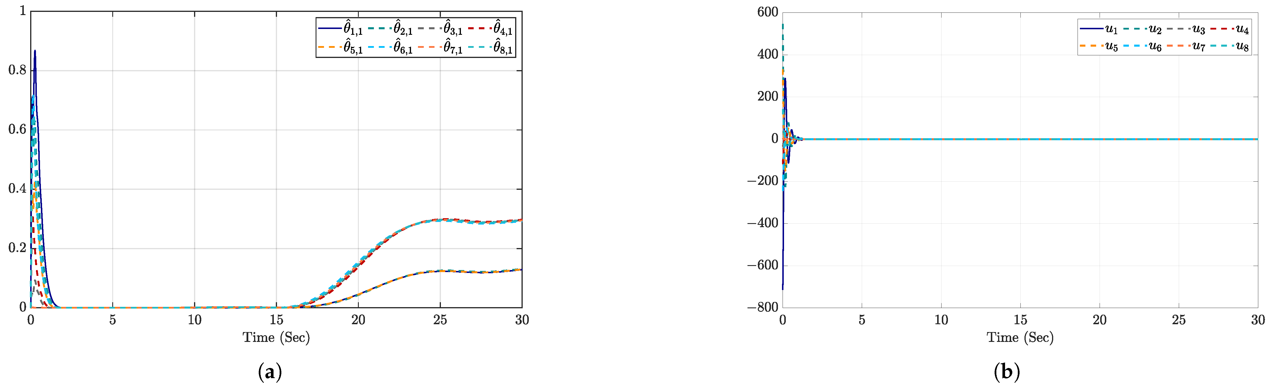 Based on Theorem 1, the virtual controller, actual control input, and adaptive laws are used. The control parameters are set as ; ; and , . By incorporating Lemma 3, .