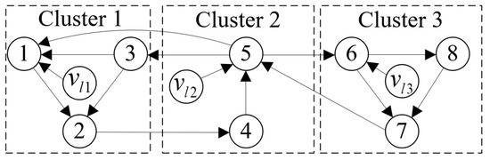 The internal communication relationship of N agents can be described by the graph . The agent set is divided into k groups with , , and . These agents represent the leaders of groups 1 through k. These groups satisfy and . The edge set . The adjacency matrix is associated with if , ; otherwise, . The diagonal matrix is with . The Laplacian matrix of is given as .