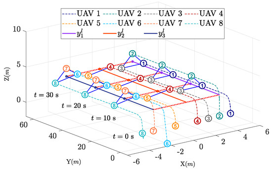 The initial states of MUAVs are concretely settled as , , , and . The control parameters are set as , , , , , and . By incorporating Lemma 3, is .