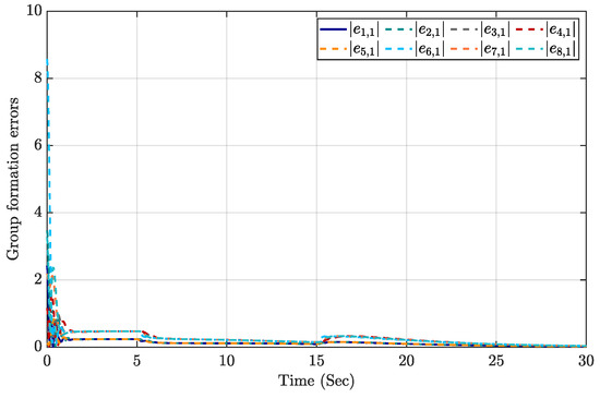 The simulation results of Example 2 are presented in Figure 7, Figure 8 and Figure 9. Figure 7 shows the trajectories of MUAVs. The UAVs can track the leaders’ reference signal satisfying and achieving the prescribed triangle formation simultaneously. Moreover, group formation control is implemented as expected. The formation shape can still be maintained after being subjected to external disturbance (39).
