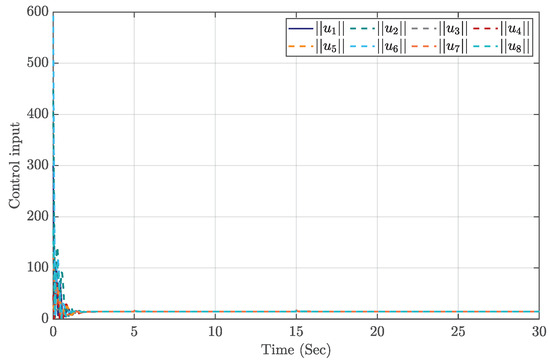 In Figure 9, the output of the controller is always bounded. It has a value of no more than 800 N. In fact, for the UAVs considered in this study, the rotors are fully capable of generating such lift. Moreover, after the system is stabilized and an external disturbance is added (i.e., after 15 s), Figure 9 demonstrates that the variation in the control input is in a range of about 5N. Thus, the UAV overcomes the external disturbance and does not consume large amounts of power.