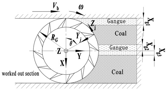 is the radius of the spiral drum; is the angle between the position of the pick cutter and the radial centerline of the spiral drum (°); xg1, xg2, xg3 are the thicknesses of the gangue layers; and is the angle at which the pick cutter cuts through the entire coal. The forces on the pick cutter are calculated using Equations (11)–(14).