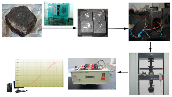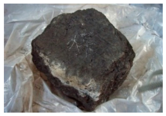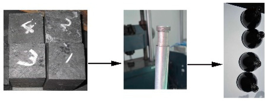 Coal-rock samples were prepared. Coal blocks approximately 50 cm × 50 cm × 50 cm in size were obtained along the coal-rock bedding, as shown in Figure 3.