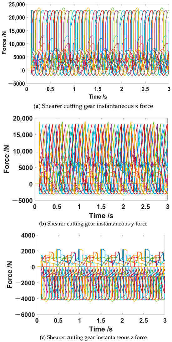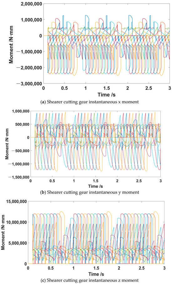 Figure 6 shows the instantaneous forces in the X, Y, and Z directions acting on the drum teeth. Different-colored lines correspond to the forces exerted by 38 teeth on the spiral drum. The maximum instantaneous forces experienced by the drum pick in the X, Y, and Z directions are 2.3817 × 104 N, 1.8831 × 104 N, and 2.258 × 103 N, respectively. Figure 7 shows the instantaneous torques in the X, Y, and Z directions acting on the drum teeth. Different-colored lines correspond to the torques exerted by 38 teeth on the spiral drum. The maximum instantaneous moments acting on the drum pick in the X, Y, and Z directions are 1.3137 × 106 N·mm, 9.308 × 105 N·mm, and 1.24733 × 107 N·mm, respectively. These simulation results provide essential data support for the rigid-flexible coupled dynamic simulation of the shearer.