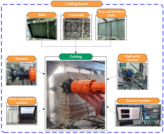 Following similarity theory, a comprehensive coal-rock cutting experimental platform was established, as illustrated in Figure 8. This test bench comprises the artificial coal wall, shearer, power system, and data acquisition system.