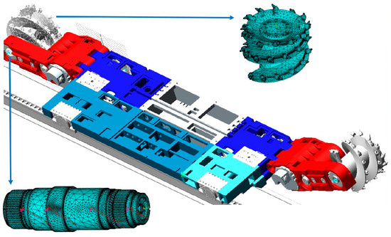 A complete model of the shearer was created using Pro/Engineer and imported into ADAMS. Finite element analysis software ANSYS (2022 R1)was employed to mesh the helical drum and output shaft, generating modal neutral files to replace the corresponding rigid components. Constraints, contacts, and driving forces were applied to the virtual prototype to establish the rigid-flexible coupling model of the shearer, as illustrated in Figure 9.